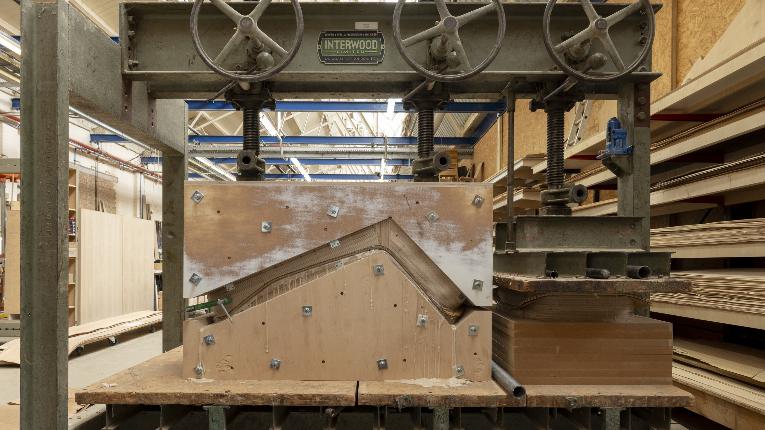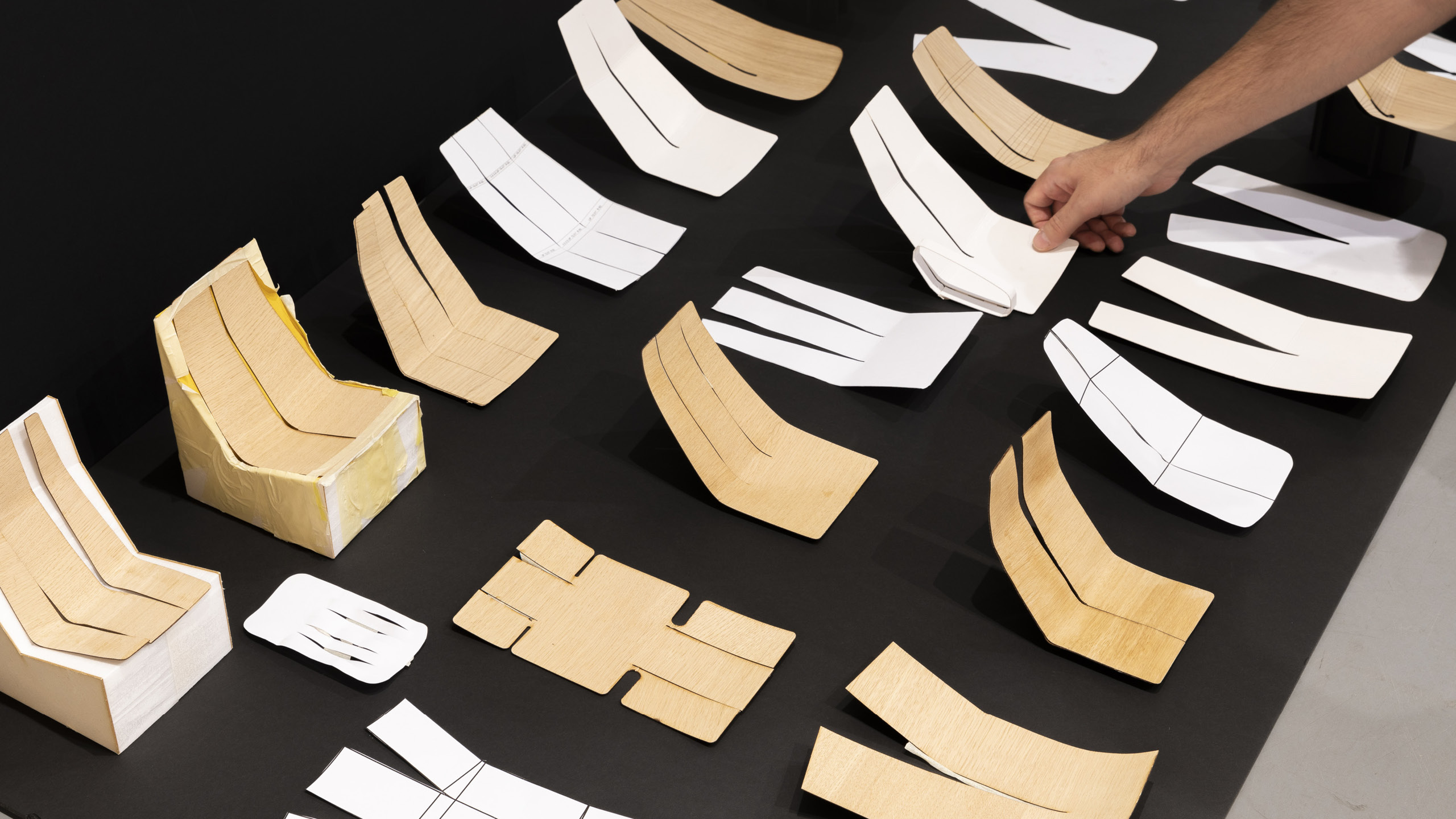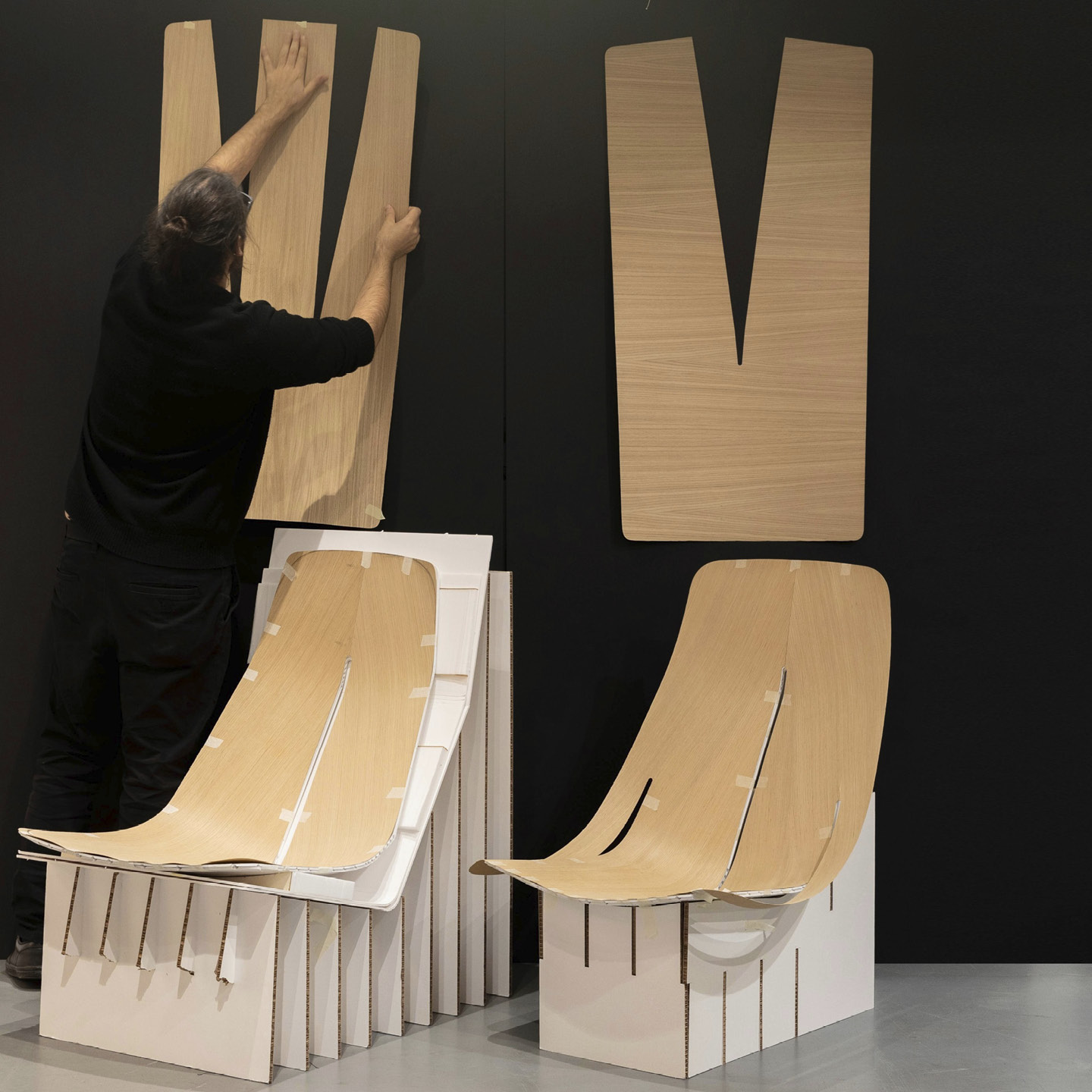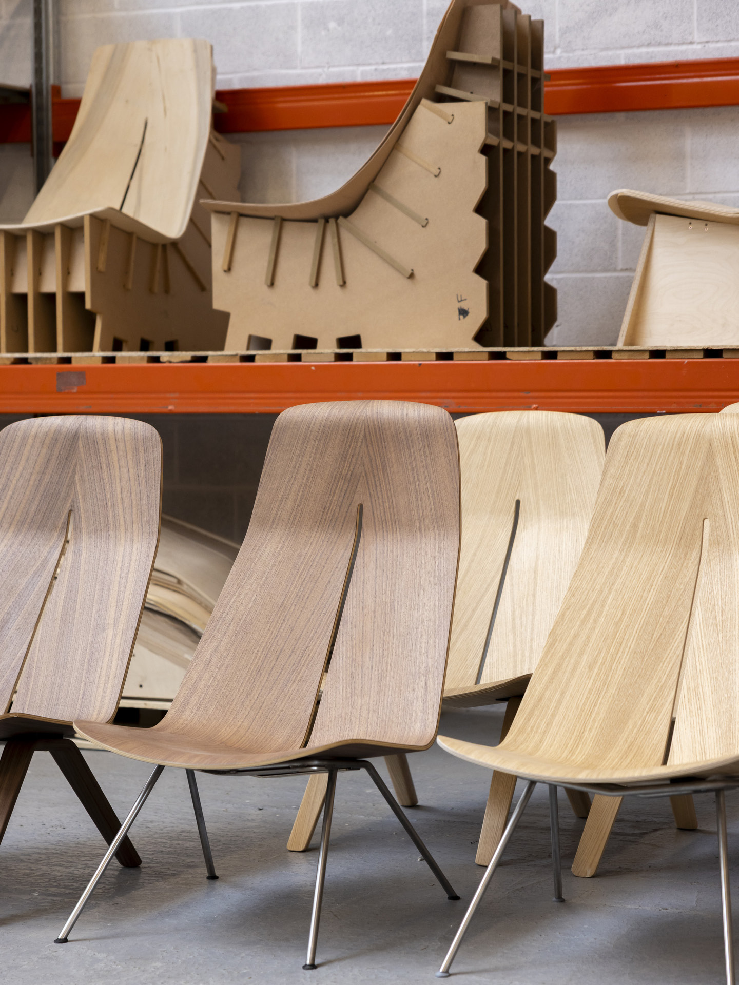 Inspired by folding techniques and engineered through extensive full-scale prototyping, the plywood chair was developed by exploring how flat surfaces translate into three-dimensional forms. Sheets of veneered timber are cut into a distinctive pattern – resembling a 'trouser' shape – which, when pressed, forms the structural ergonomic shape of the chair. The seat is supported by matching plywood or metal tube legs, which seamlessly connect with the chair's form. An optional padded seat cover adds an additional layer of comfort.