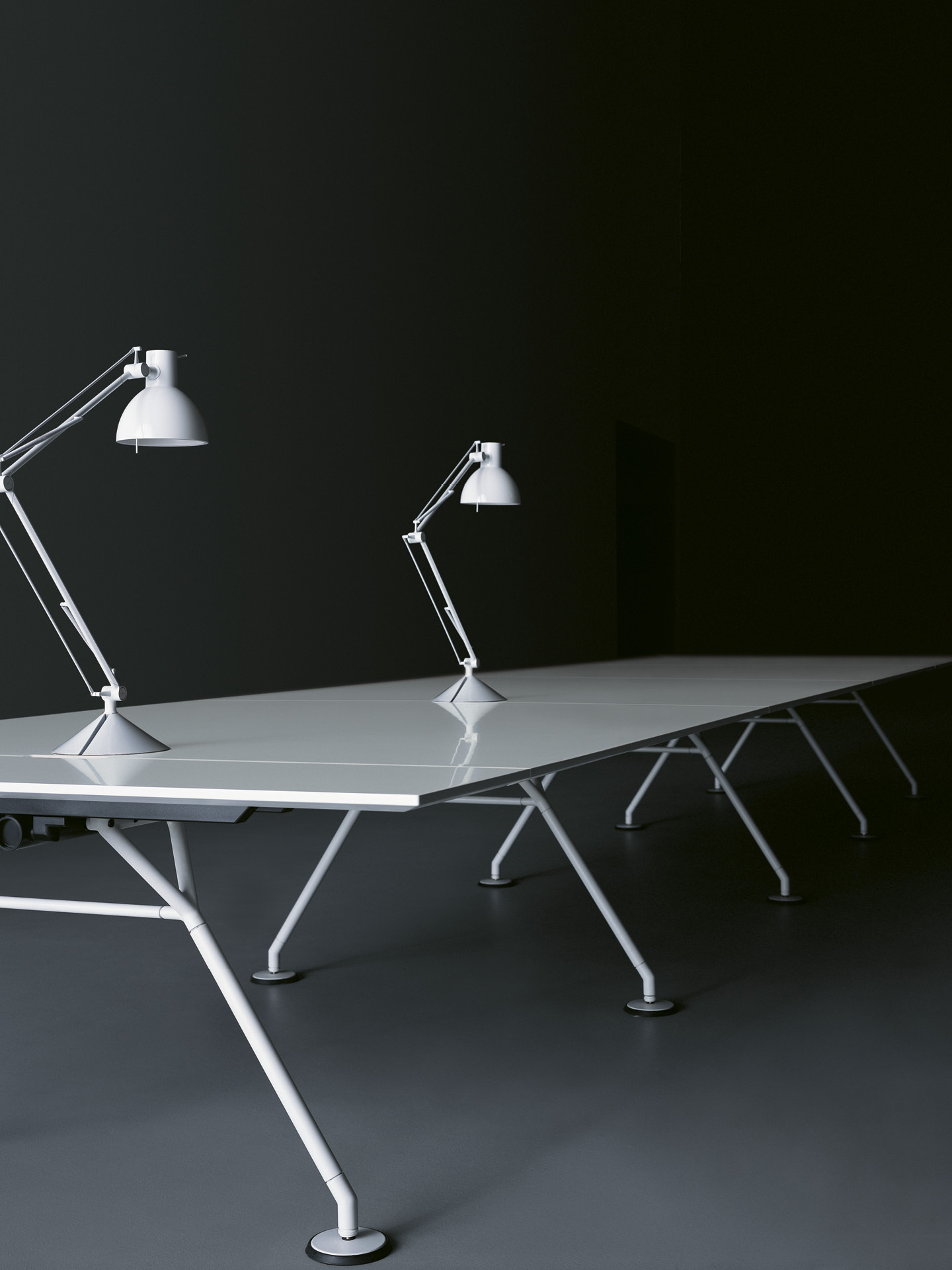 Nomos (a Greek word that means 'fair distribution') is conceptually based on the relationship between the user and the space they occupy. With its characteristic splayed feet, the desk is evocative of the Lunar Landing Module, or a grasshopper with its thin body and slim legs. Utilising its stable frame, the system can accommodate shelves, storage, screens, lighting and signage - an assembly governed by the ergonomics of the human form, seated or standing. The Nomos table and Nomos system has been manufactured by Tecno since its introduction in 1986. During this long and successful production period, the table and desking systems have evolved into new products and been launched in a series of new finishes.