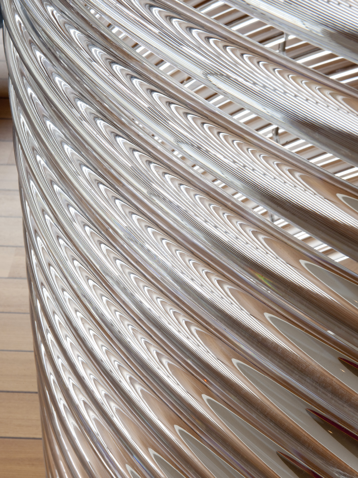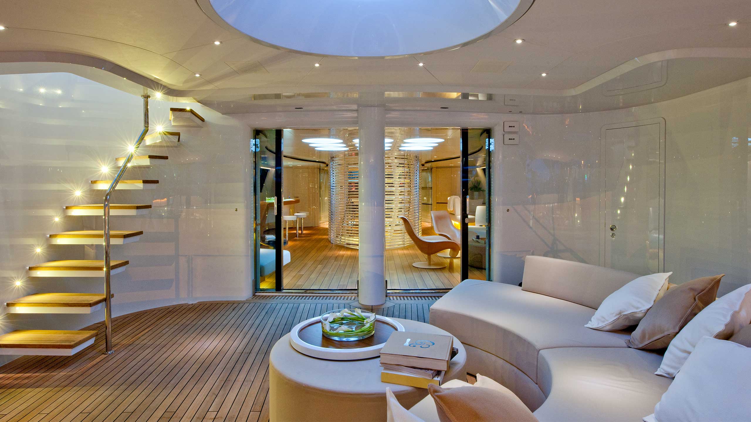 The interior design emphasizes its structural form, with the exposed aluminium hull complemented by a natural palette of teak and saddle leather, to create a discreet sense of luxury. Panthalassa accommodates up to twelve guests and ten crew members, offering a variety of spaces that balance private retreat and flexible open living areas.